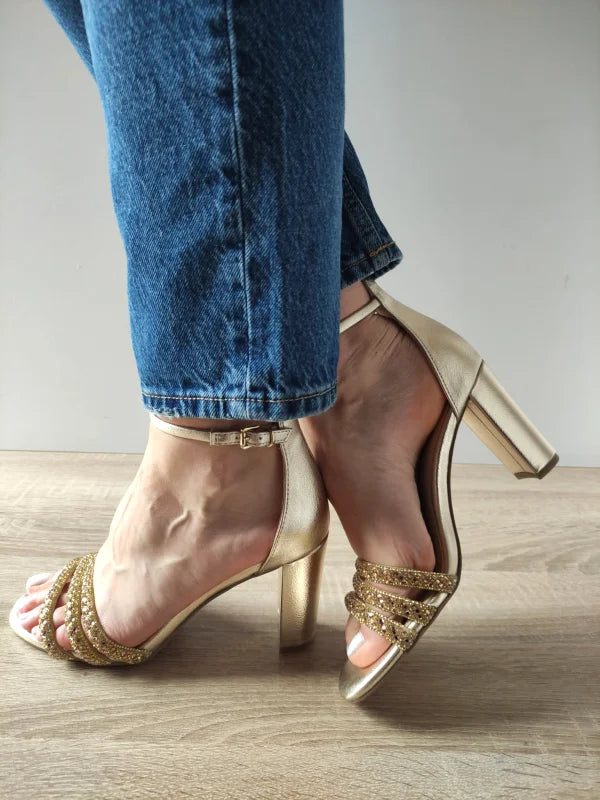 Eleganță și strălucire la superlativ! Aceste sandale Marco Tozzi în nuanță aurie metalizată adaugă un plus de glam oricărei ținute. Baretele fine, accesorizate cu pietre strălucitoare, conferă un aspect sofisticat, iar tocul gros de 8.5 cm oferă echilibru perfect între stil și confort. Sunt alegerea ideală pentru evenimente speciale, nunți sau petreceri.