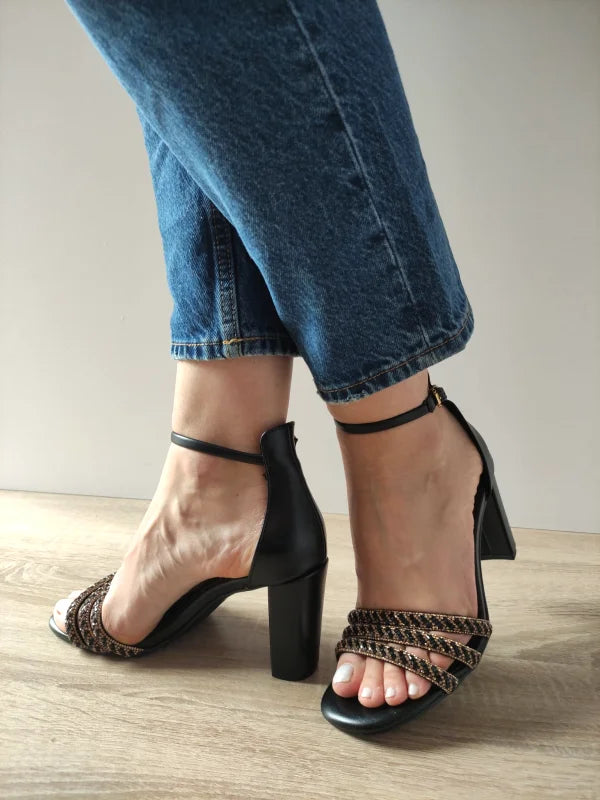 Strălucește discret, dar sigur, cu aceste sandale elegante negre de la Marco Tozzi! Designul cu barete subțiri ornate cu pietre fine și finisajul negru rafinat le transformă într-o piesă de rezistență pentru ținutele tale de seară. Tocul gros de 8.5 cm oferă stabilitate, iar închiderea cu cataramă la gleznă asigură o fixare sigură și elegantă.