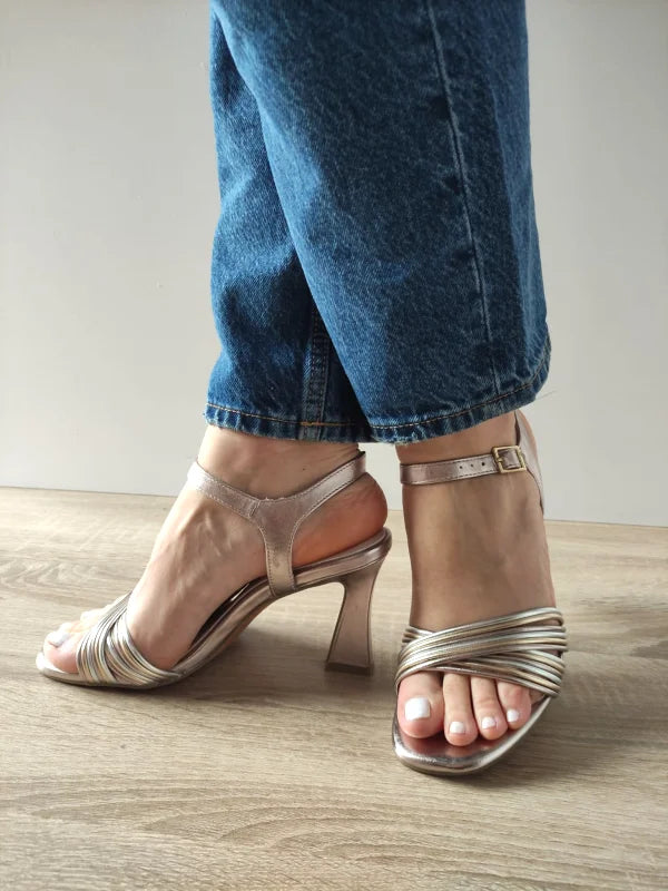 Adaugă o notă strălucitoare fiecărei apariții cu aceste sandale elegante Marco Tozzi în nuanțe aurii și argintii, perfecte pentru ocazii speciale. Designul cu barete fine și lucioase creează un efect vizual deosebit, în timp ce tocul înalt de 9.5 cm conferă siluetei un plus de grație și rafinament.