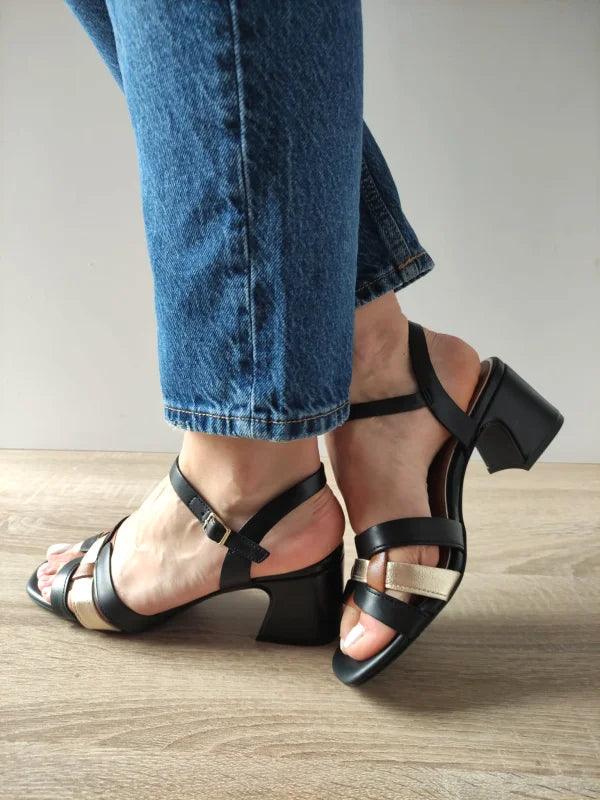 Eleganță clasică cu un twist modern, aceste sandale Marco Tozzi atrag atenția prin combinația rafinată de negru, auriu și maro. Designul cu barete late și elemente metalizate adaugă un plus de stil, iar tocul mediu de 7 cm oferă echilibrul ideal între înălțime și confort.