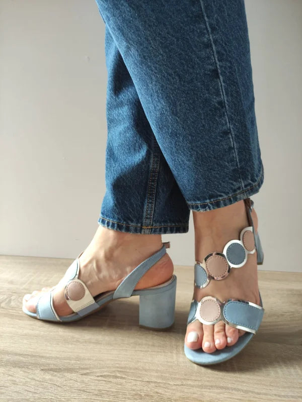 Un design artistic și feminin — aceste sandale de la Marco Tozzi îmbină pielea ecologică cu material textil într-un joc vizual spectaculos de cercuri în nuanțe pastelate de bleu și roz nude, perfecte pentru ținutele casual-elegante de vară. Tocul gros de 7 cm oferă confort, iar prinderea cu cataramă asigură stabilitate.