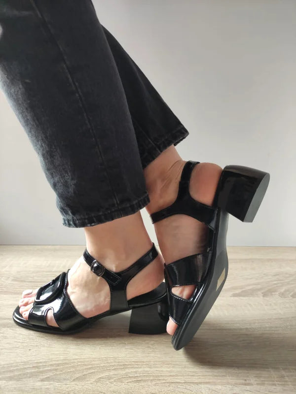 Eleganță pură într-un design rafinat! Aceste sandale negre din piele lăcuită atrag atenția prin detaliul frontal oversized și prin luciul sofisticat al materialului. Tocul gros oferă stabilitate, fiind ideal pentru ținute de zi sau de seară.