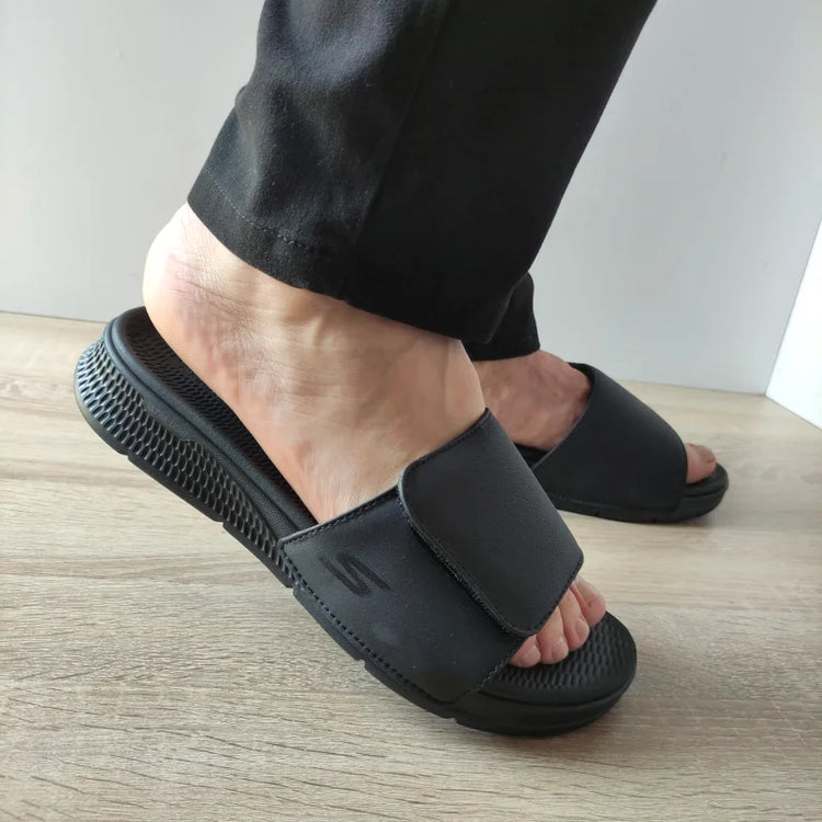 Descriere: Simpli, practici și comozi, șlapii pentru bărbați Skechers 229033 în culoarea negru sunt alegerea ideală pentru vară, vacanță sau purtare zilnică. Realizați din piele ecologică, aceștia oferă un aspect uniform, modern, cu o baretă lată cu închidere cu scai, care permite reglaj rapid și confortabil. Talpa ergonomică este ușor curbată pentru a oferi susținere în zona călcâiului și confort în timpul mersului. Cu o înălțime totală de 7 cm și o grosime a tălpii de 3.5 cm în zona călcâiului, sunt ideali pentru activități lejere în sezonul cald.