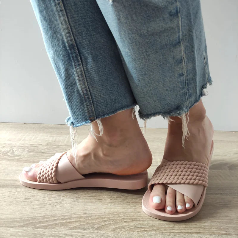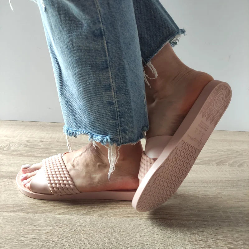 Confort și feminitate într-un singur model: șlapii Ipanema Renda II în nuanță roz pastel sunt alegerea perfectă pentru zilele însorite. Baretă lată cu textură împletită în relief, poziționată oblic pentru o notă de rafinament vizual. Talpa moale și flexibilă te însoțește oriunde, de la plajă până la plimbările urbane.